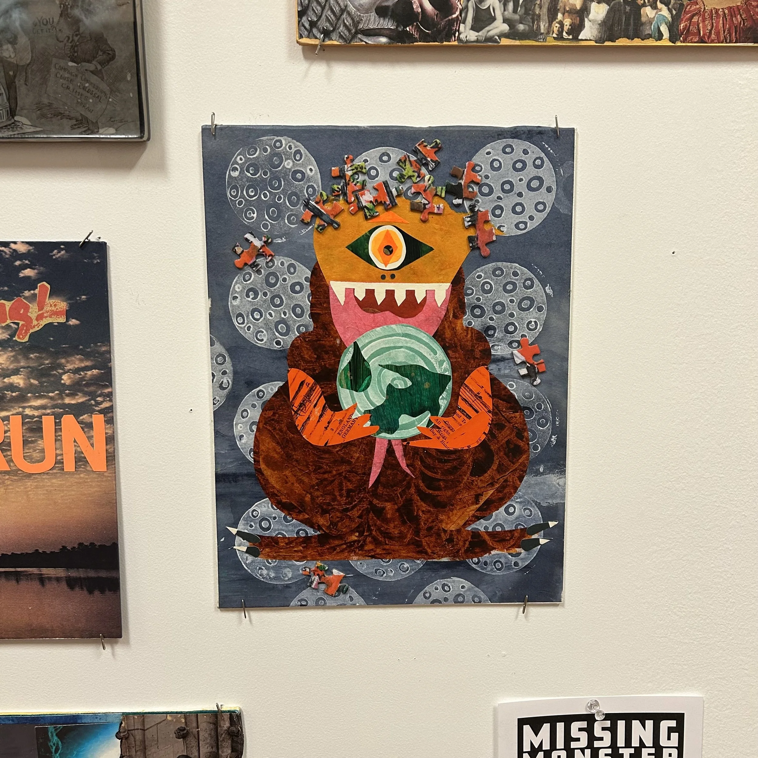 My collage titled “Big Orange Monster Consumes the World” is part of a fun exhibition at the Kolaj Institute in New Orleans through October 18, 2025. I couldn’t resist the call to artist to create a monster out of cut-paper collage and hand-painted paper.